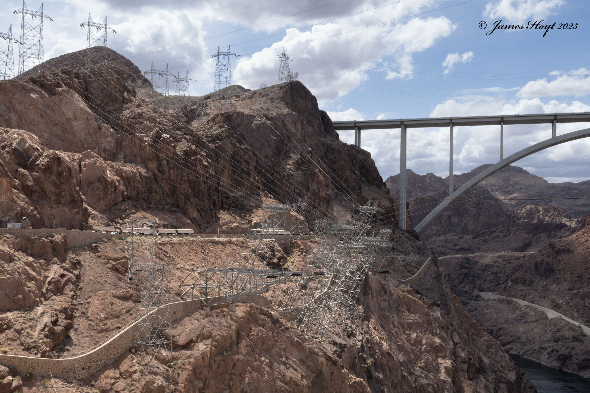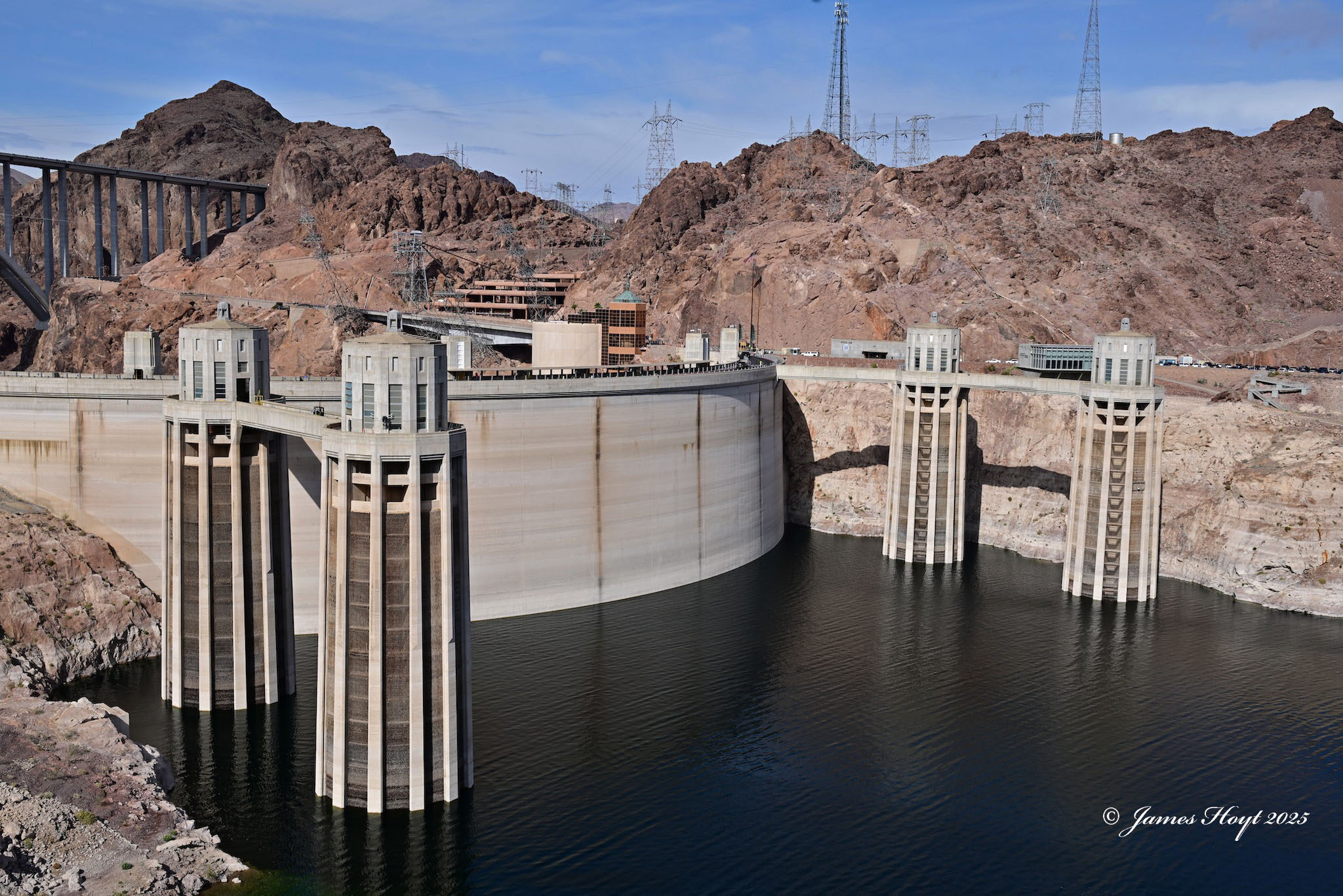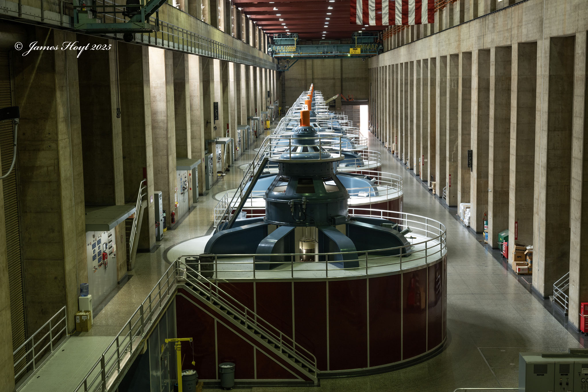 Hoover Dam Turbine power generators. Two 30 Foot inlet pipes that feed the turbines Hoover Dam Colorado River Power transmission cables Storm over Lake Mead